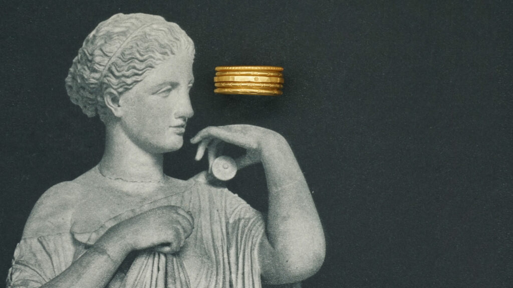 Une bague corps en lyre cumulée avec l’alliance soleil.