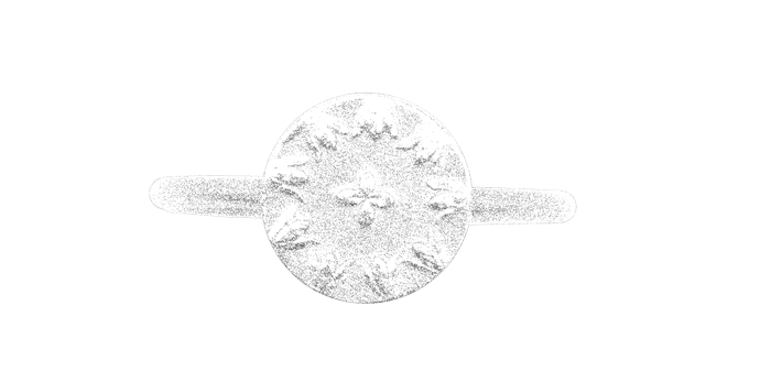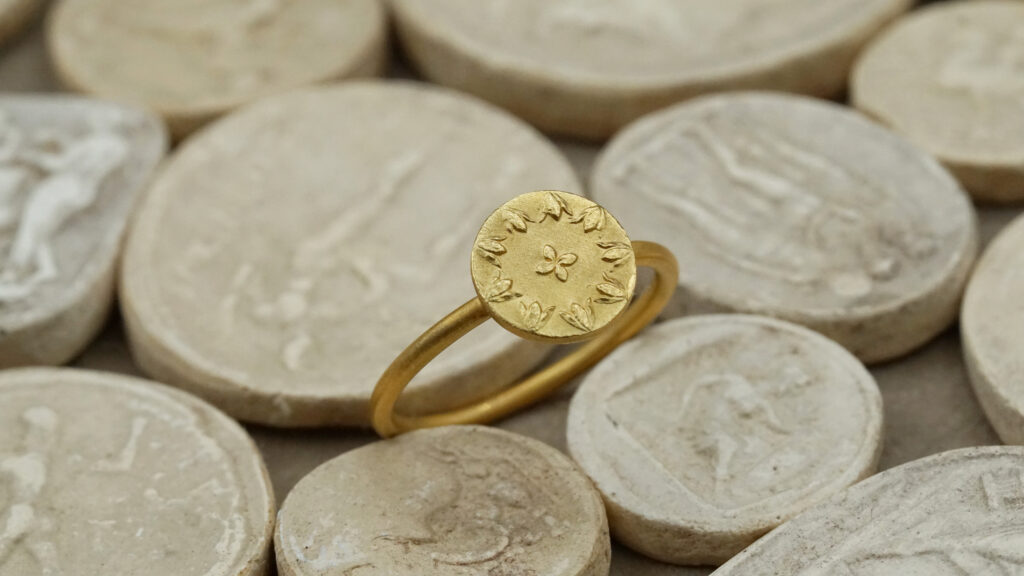 Un corps de bague en fil rond Ø1,5mm surmonté par une médaille dont le motif est en relief.