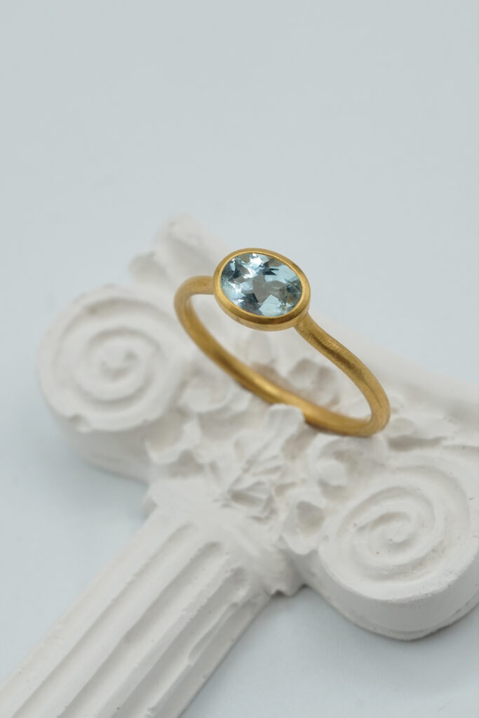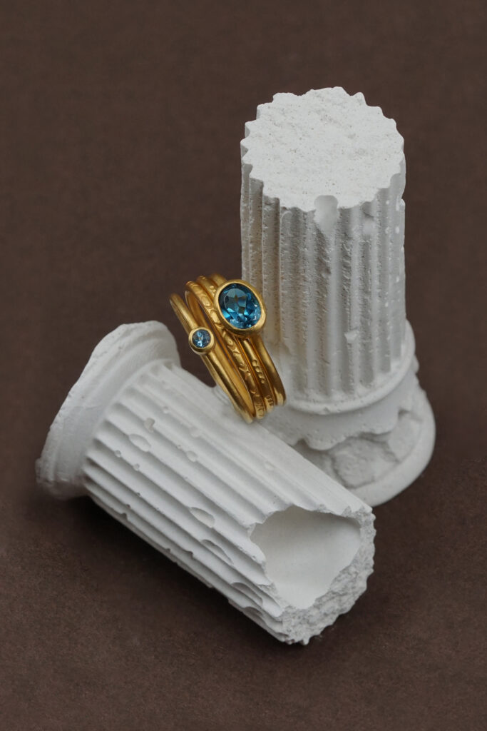 La bague Orphée se porte seule ou bien accompagnée d’anneaux ciselés, de bagues fines. Imaginez votre Olympe et composez votre ensemble de bagues.