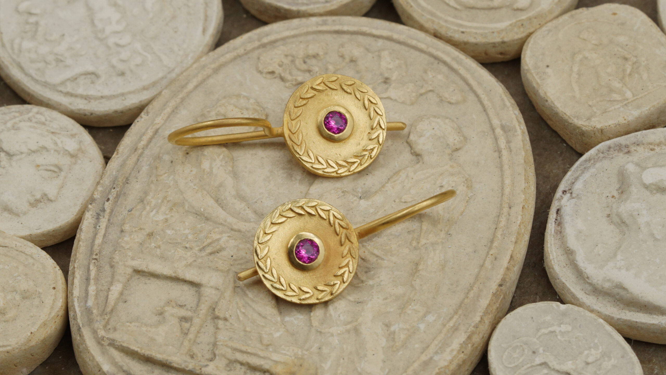 Une paire de boucles d’oreilles en or 18 carats et pierres s’inspirant de l’Égide : le bouclier d’Athéna.