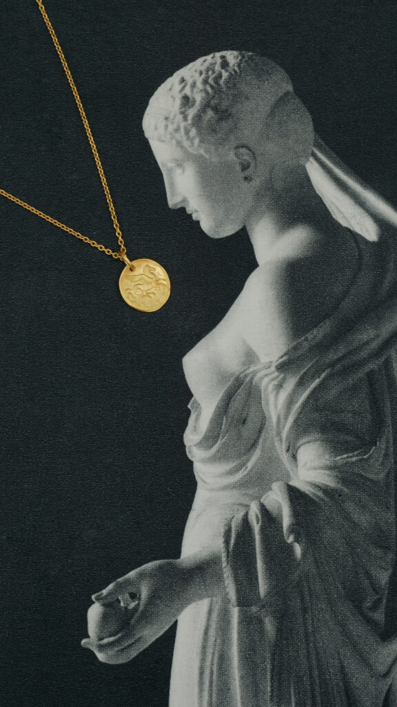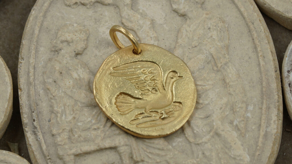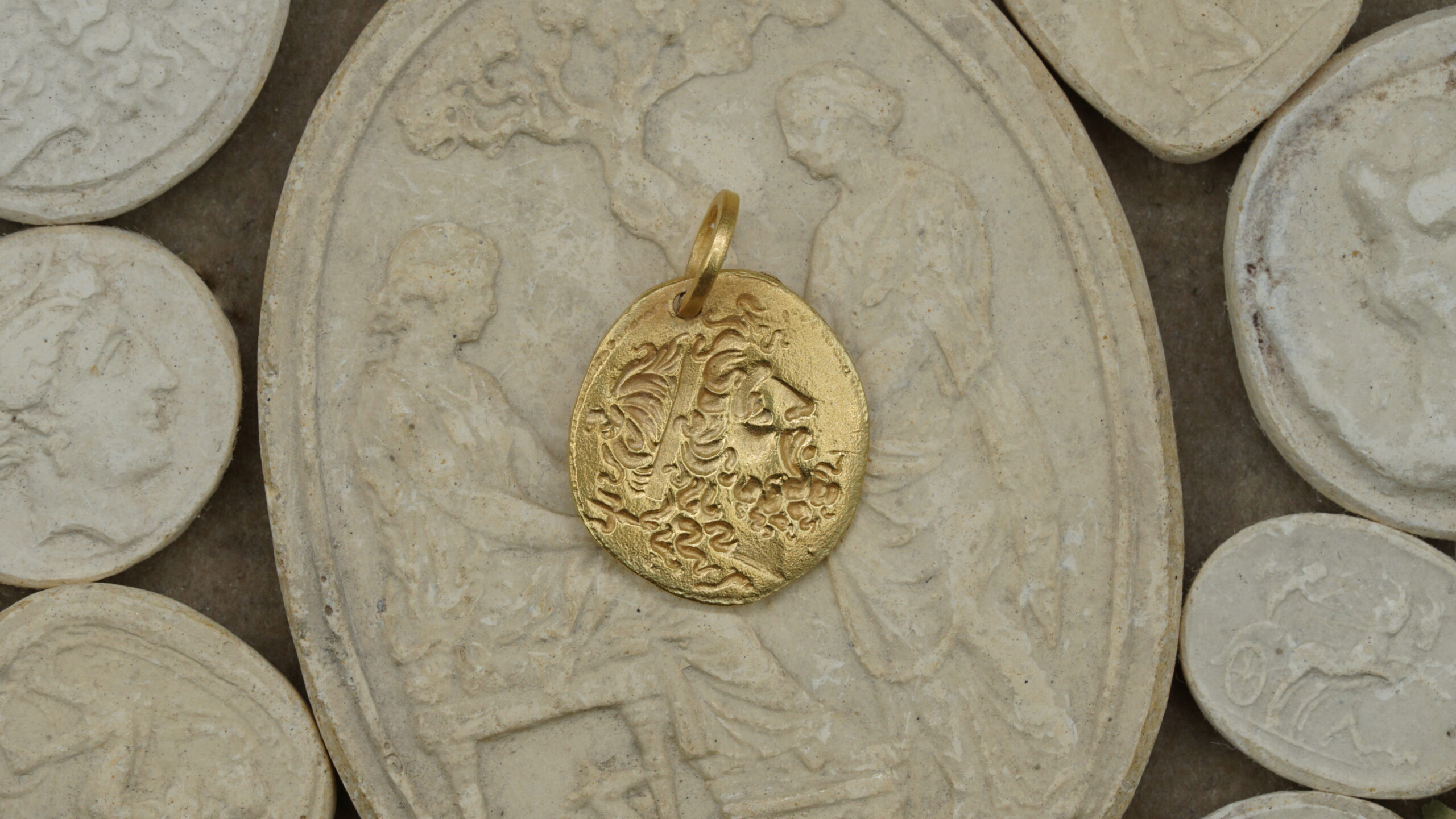 Un pendentif médaille en or 18 carats reprenant les motifs des intailles gréco-romaines.