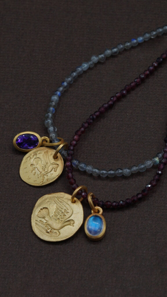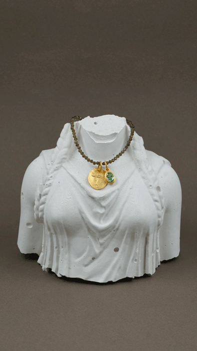 Cette médaille antique se porte seule ou bien accompagnée de pendentifs avec des pierres facettées ou taille cabochon.